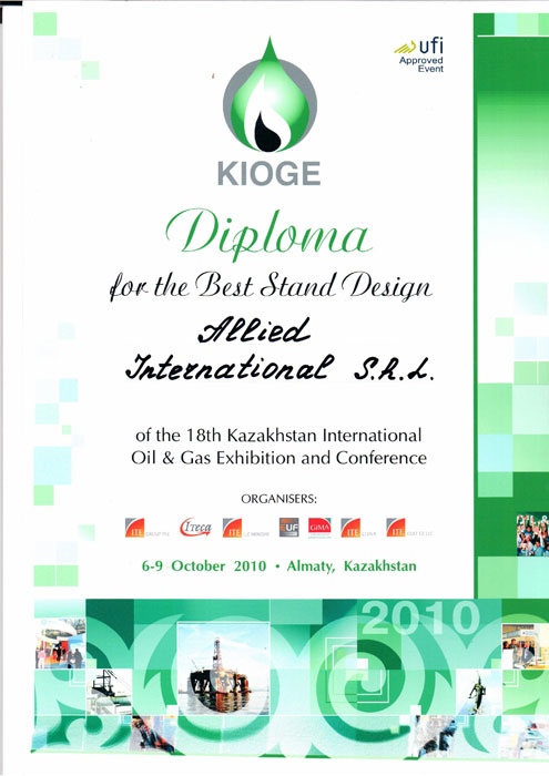 Quest'anno il Kioge, l'esposizione che si tiene annualmente ad Almaty (Kazakistan) ed è considerata la più importante per il settore petrolifero dell'Asia centrale, ha portato ad Allied un nuovo riconoscimento internazionale. Il comitato organizzatore della fiera, ITECA, nel corso della serata di gala che ha segnato l'apertura ufficiale della manifestazione, ha assegnato allo Stand del Gruppo il Premio per il Miglior Design, confermando così come ancora una volta l'azienda abbia saputo veicolare la propria immagine nel modo più incisivo.