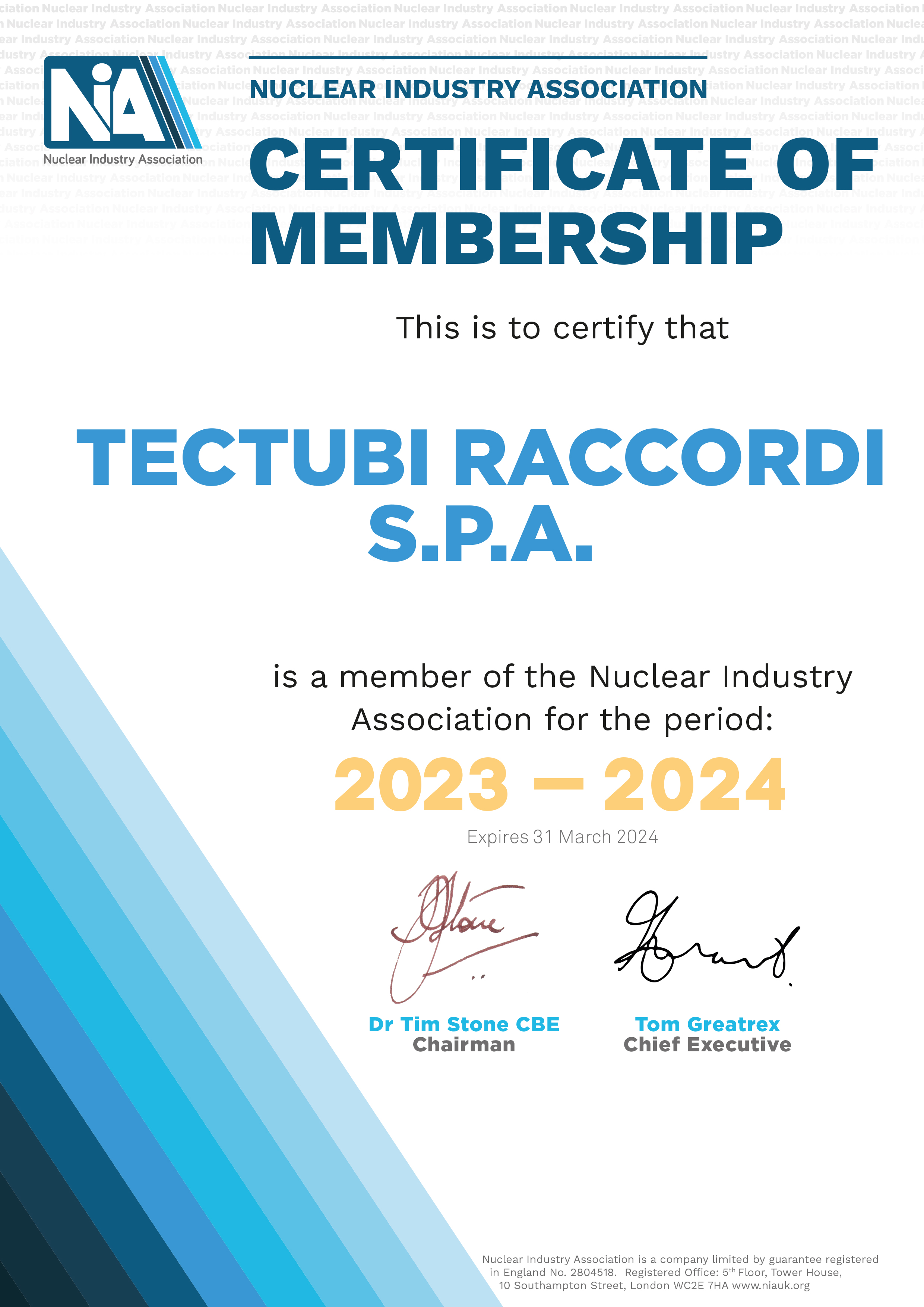 Tectubi Raccordi si è associata alla NIA, l'associazione di imprese per l'industria nucleare del Regno Unito, finalizzata a sostenere li settore nucleare britannico e a massimizzarne le attuali e future opportunità.